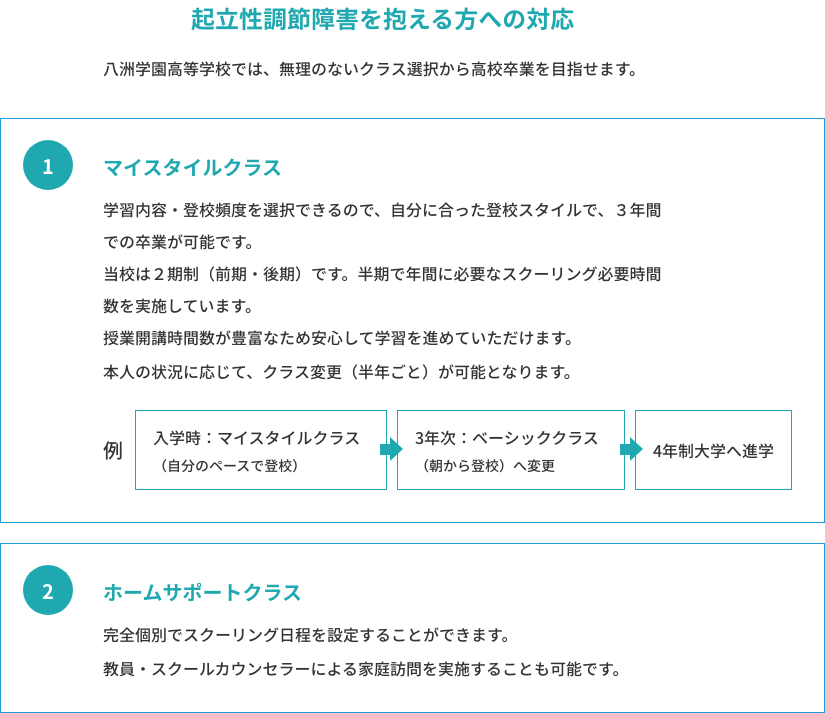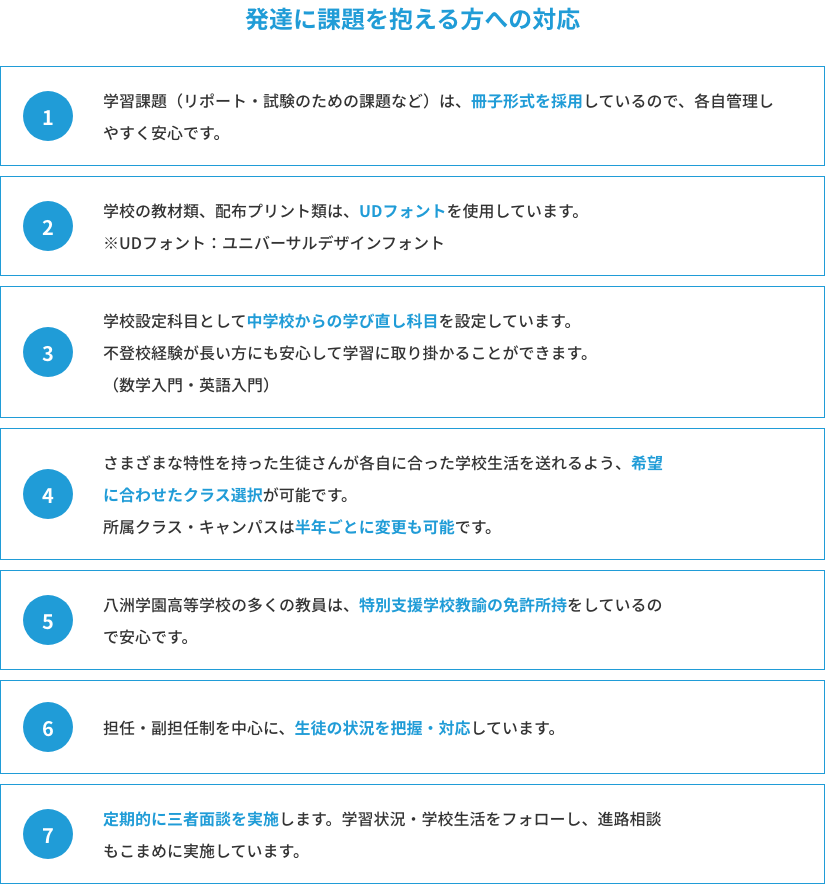例えば、 発達に課題を抱えた方や起立性調節障害を抱えた方、 不登校経験がある方など、 学校生活に不安を抱える方でも通いやすい豊富なクラス設定や 、 学習環境作りなどを積極的に行っています。みなさん1人ひとりが自分らしく楽しく学校へ通っていただくために、教職員も全力でサポートいたします。