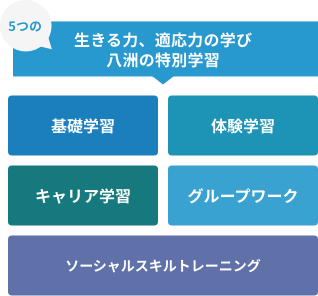 特別学習は、過去10年間の取り組み内容をいかし「基礎学習」「体験学習」「キャリア学習」「グループワーク」「ソーシャルスキルトレーニング」を5本柱として設定し、到達目標を明確にしました。