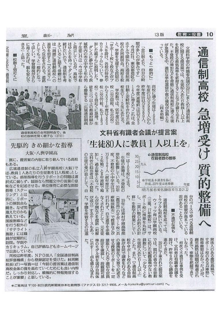 当校校長が読売新聞社の取材を受け、新聞に掲載されました。