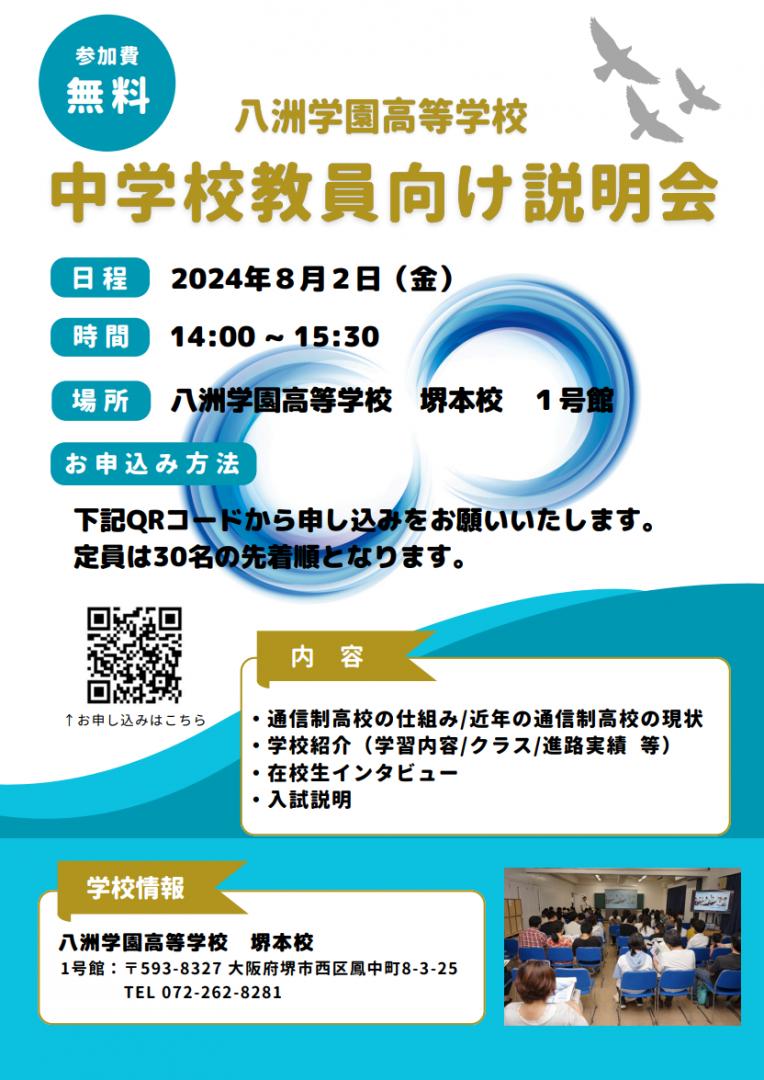 8月2日(金)14時より堺本校にて教育関係者を対象とした「教員対象説明会」を開催します。